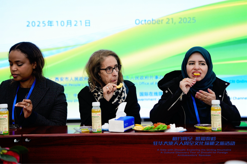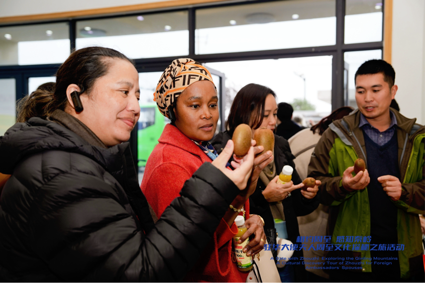 驻华大使夫人品尝着不同品种的猕猴桃以及各式各样的猕猴桃深加工食品,纷纷称赞其细腻的口感、独特的风味和浓郁的果香。“这不仅是一次味觉的享受,更是一次对中国乡村产业振兴的直观感受。”摩洛哥驻华大使夫人表示,“我非常期待后续可以和周至合作,因为摩洛哥很喜欢这种水果,我也希望可以在这里学到一些产业发展的知识,并把这些知识带回我们国家。”